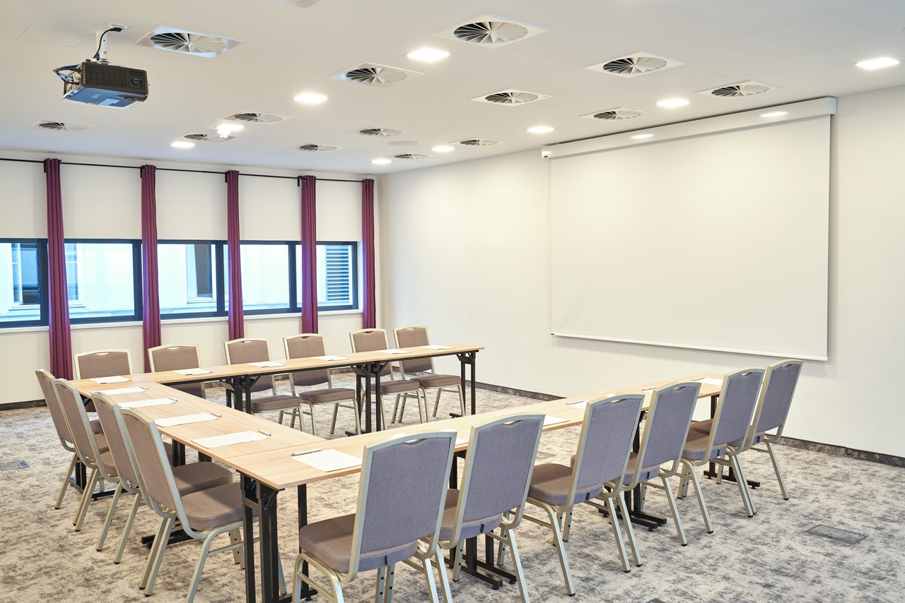 Our event hall for 50 people with natural lighting, built-in technology (projector, sound system, screen) awaits our dear guests in a modern design on the second floor of our hotel, this ensuring the tranquility of the meetings.
